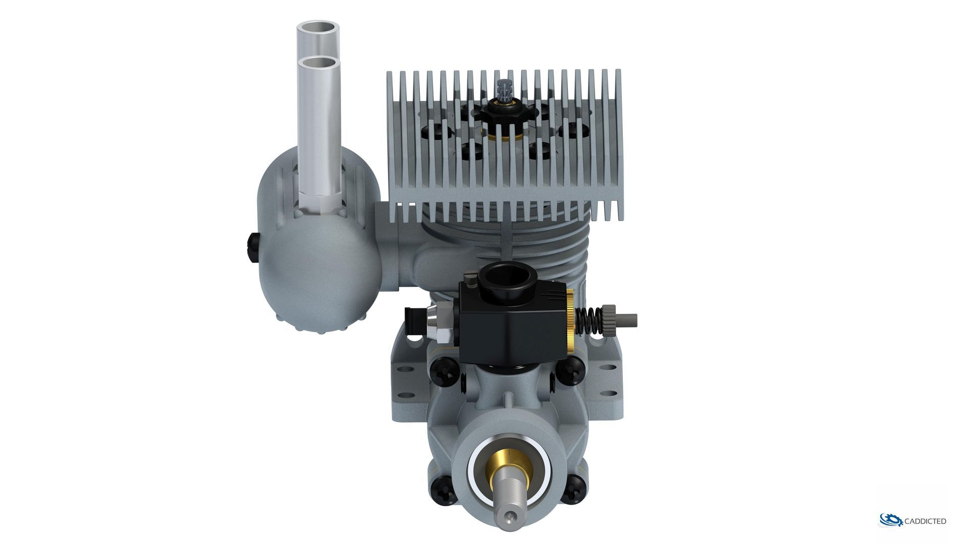 Single cylinder 2-stroke engine with glow plug ignition, Schnürle flushing, rotary valve crankshaft and side exhaust, carburetor with cylindrical throttle plug. Extreme cooling head for RC cars.