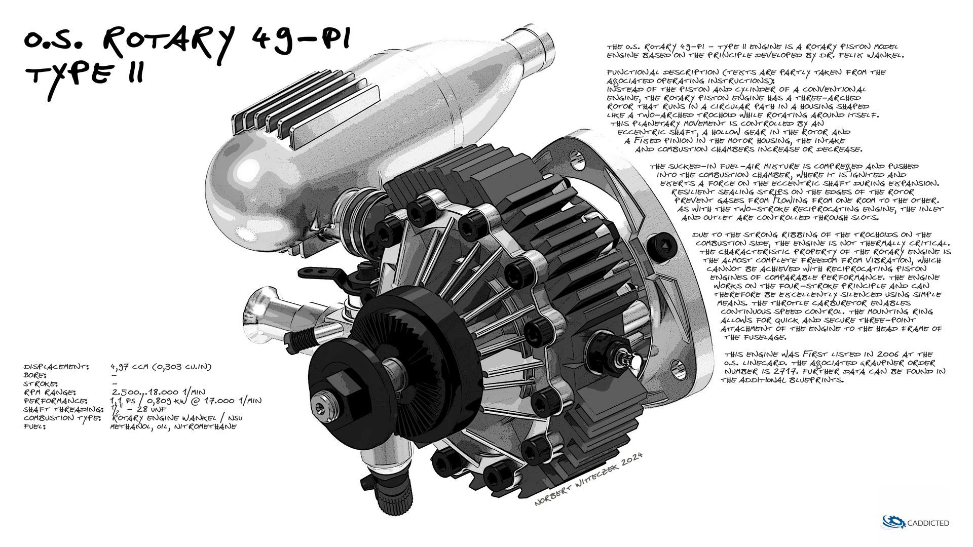 I implemented the engine in CAD as part of the digital restoration of my Henseleit Three-Dee-MP-50 helicopter, that was back in 2018. In my eyes, Jan Henseleit is one of THE RC-helicopter designers par excellence. It is absolutely remarkable what great machines he has created in the course of his professional activities. Unfortunately, I never got to fly the different types as much as I would have liked... but such is life. ;o)