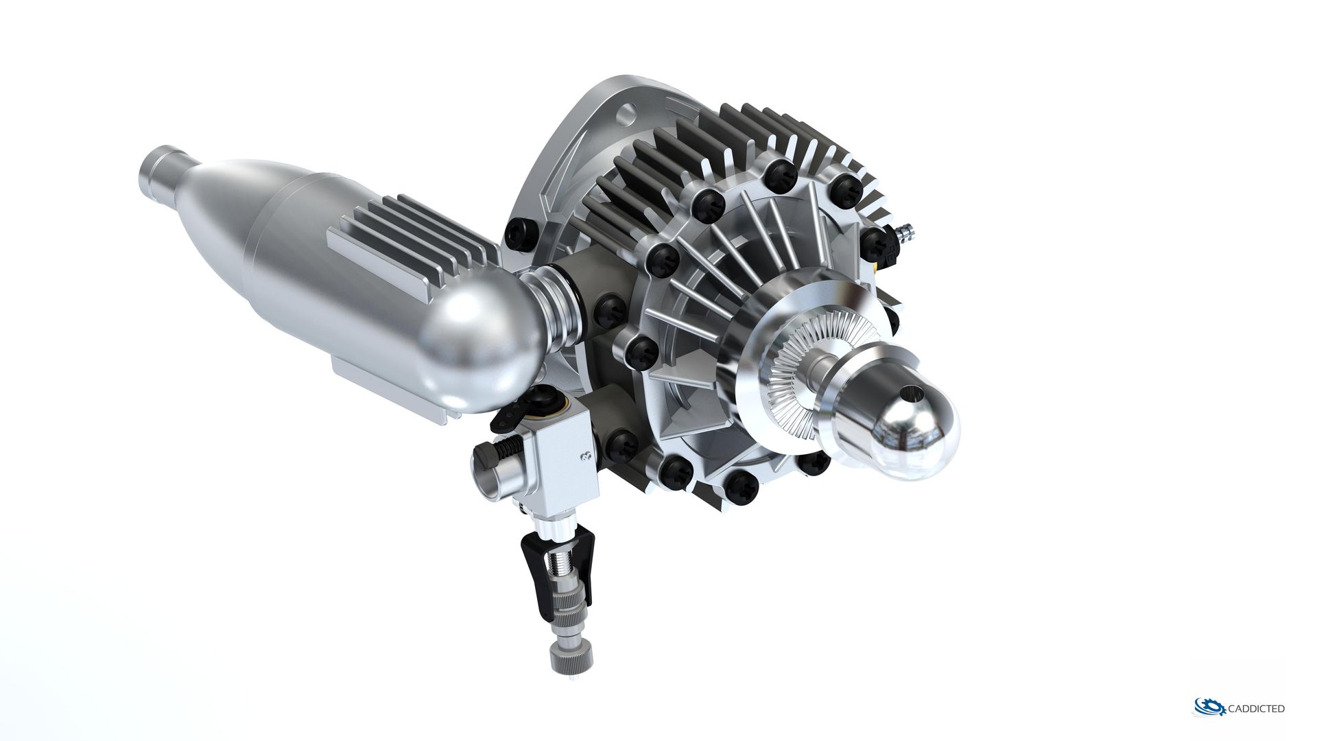 The engine can be continuously regulated over a wide speed range using the throttle carburetor. The associated silencer reduces the exhaust noise to a minimum without significantly affecting the performance. The mounting ring enables the engine to be attached quickly and securely to three points.